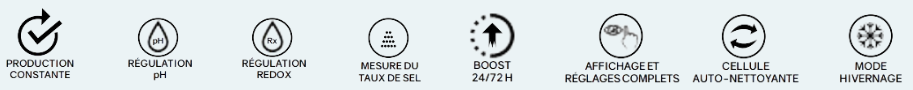 - Interface intuitive : Température de l’eau, quantité de sel à ajouter, valeur pH, valeur redox, nombre d’heures de fonctionnement de la cellule...