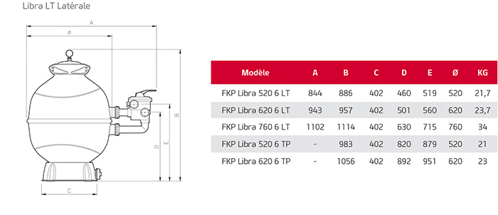 Caractéristiques Techniques du Filtre à sable Espa Série LIBRA 12 m3/h