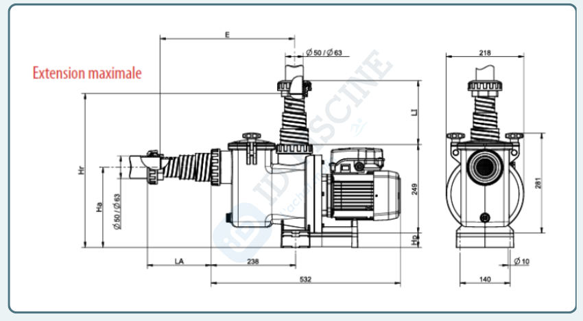 Livrée avec : Raccords de tuyau Ø 63, adaptateurs de tuyau Ø 50, 4 cales : 2 de 30 mm et 2 de 10 mm et 2 m de câble avec fiche type F.
